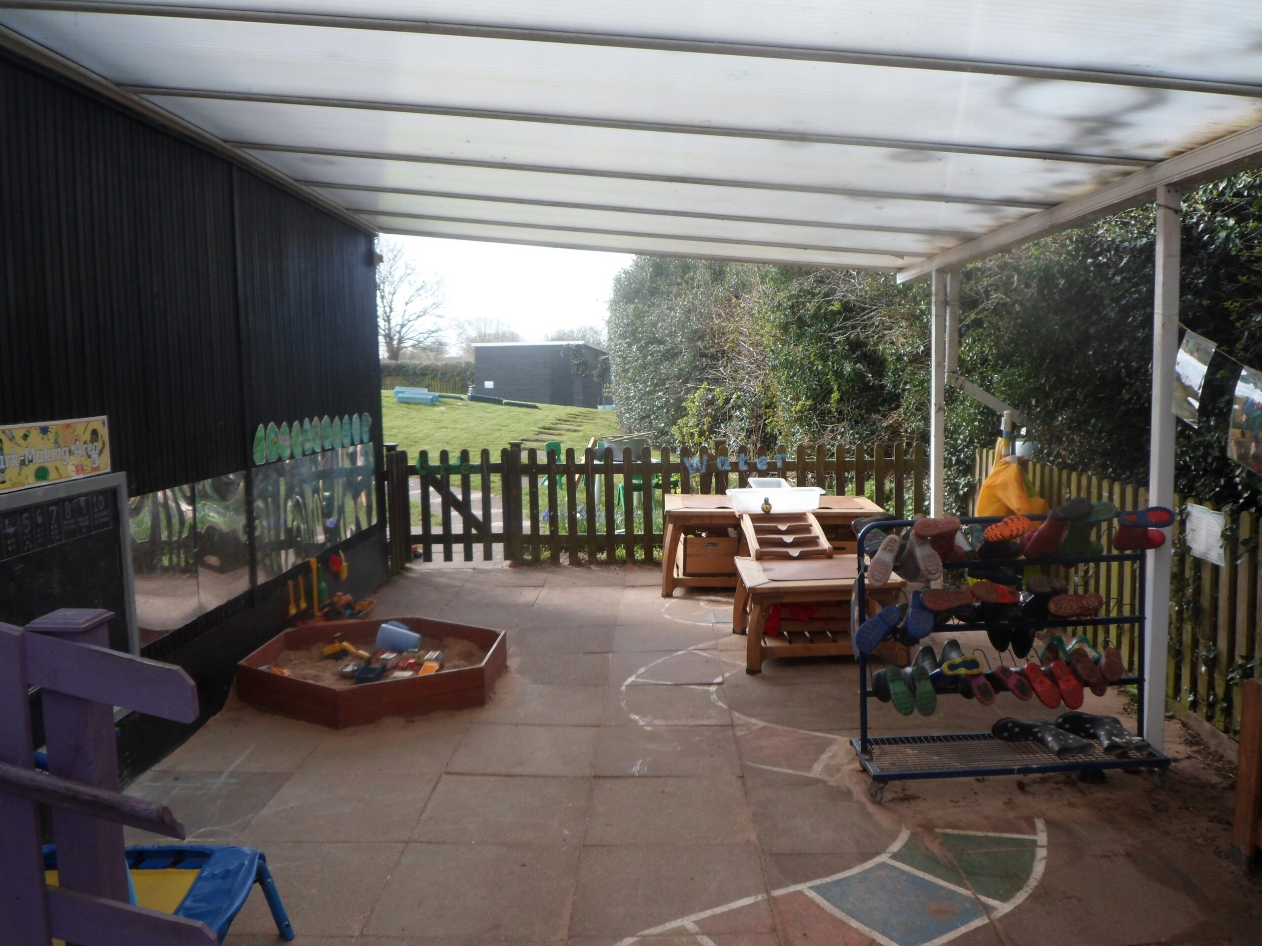 * Our all-weather canopy where children can access the construction area, chalk board, mud kitchen and sit-in sandpit.